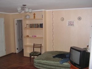 В одной комнате стоит двухспальная кровать,телевизор, шкаф, тумба. Другая сделана в виде гостиной, в комнате диван раскладной, телевизор, обеденный столик.