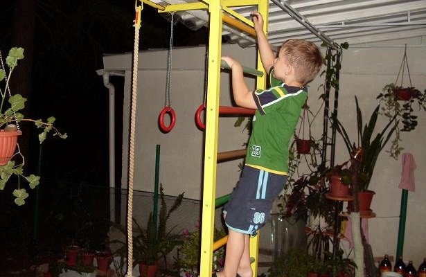 Имеется выход во дворик, где под навесом для отдыха стоит мягкий диван, столик.