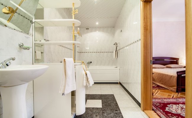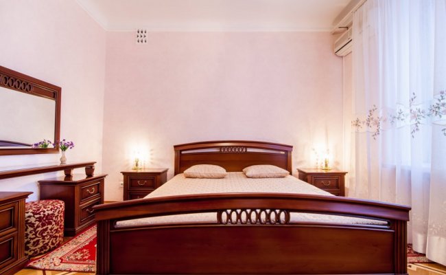 Апартаменты класса люкс имеют две комнаты. Здесь вы найдете понастоящему домашнее тепло и уют. Ковры, добротная деревянная мебель окружат вас в номере этого типа. Две полуторных спальных кровати, шкаф, обеденный стол и стулья, рабочий уголок, холодильник и телевизор – здесь есть все для вашего комфортного пребывания. Отдельный санузел с душевой кабинкой или ванной, ежедневная уборка. Имеются 2-х комнатные люксы с кондиционерами.