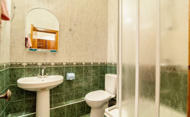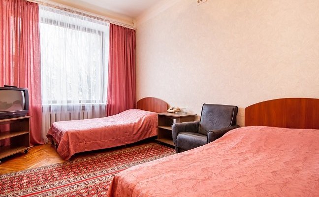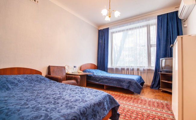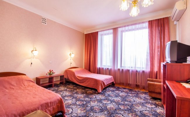 Однокомнатный номер стандарт предоставит комфортное пространство для проживания двух человек. Здесь есть вся необходимая мебель: две полуторные кровати, кресло, письменный стол/журнальный столик, телевизор, холодильник, отдельный санузел с душевой кабинкой. Убирается ежедневно.