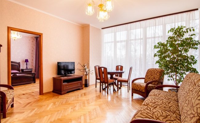 Просторные апартаменты высшего уровня комфортности имеют современный дизайн и обставлены современной мебелью. Тут три уютных комнаты, из мебели есть большая двуспальная кровать, диван, кресла, туалетный столик, шкаф. Также тут установлен кондиционер, есть холодильник, телевизор, отдельный санузел с ванной джакузи. Убирается ежедневно.