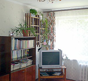 В зале стоит двуспальный диван, шифоньер, телевизор с диагональю 72 см, шкаф с книгами, обеденный стол и кондиционер.