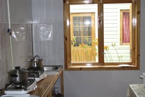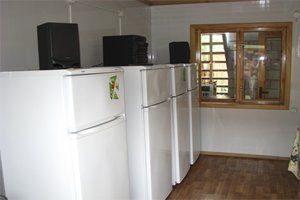 Есть кухня- холодильники (1 на 2 ком.), печки, посуда, мойки, микроволновка, стол.