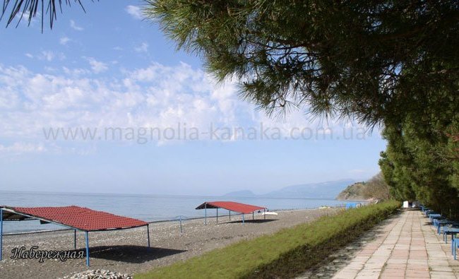 Всего лишь в 250 метрах от здания коттеджа «Магнолия-Канака» раскинулся чистейший галечно-песчаный пляж, простирающийся более чем на 2 км вдоль Канакской бухты и шириной около 50 метров. Пляж оборудован навесами, кабинками для переодеваия. Есть прокат зонтов, шезлонгов, катамаранов. Путь к морю лежит вдоль тенистой кипарисовой аллеи по территории пансионата «Волга». Аллея ровная, без утомительных спусков и подъемов.