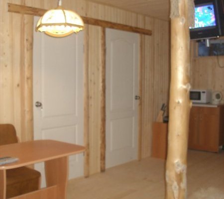 Летом в них прохладно, а зимой, благодаря печке, всегда тепло. В спальнях домиков вы прекрасно выспитесь на больших двуспальных кроватях. В каждом домике есть гостиная-кухня, и санузел.