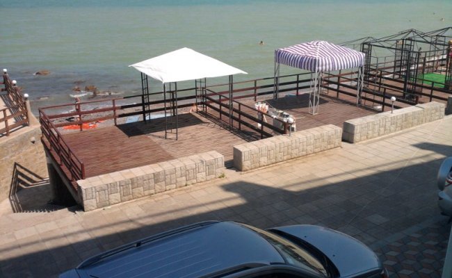 Фасад смотрит в сторону пляжа, на моря, на набережную, выложенную красивой фигурной плиткой. Территория дачи находится под постоянной охраной, для въезда на авто действует пропускной режим. Отдыхающих значительно меньше, чем на общественных пляжах. Пляж галечно-песчаный, кое-где разбросаны небольшие валуны.