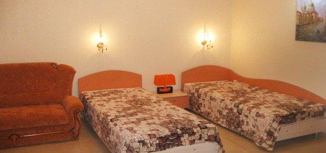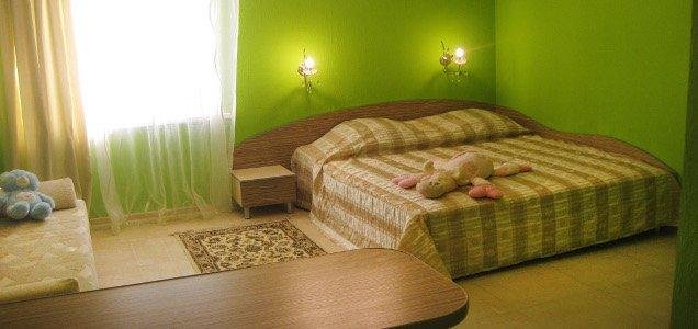 Номера «Люкс» 2-х комнатные дополнительно оборудованы кухней (СВЧ печь, инфракрасная электроплита, холодильник, мойка, набор посуды). Для тех кто планирует летний отдых с детьми на море, есть возможность дополнительно установит детскую кроватку, что обеспечит отдых с детьми без ограничения возраста.